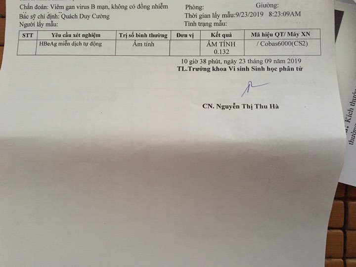 Hung NguyênNỗ lực điều trị viêm gan b mãn tính cuối cùng cùng được đền đáp rồi. đến giờ vẫn chưa hết run vì mừng khi cầm phiếu xét nghiệm âm tính. Mới 3 tháng trước chỉ số virus của tôi vẫn ở mức cao, k ngờ dùng có hơn 3 liệu trình thuốc của tiến sĩ Dũng với heposal mà lại hiệu quả đến vậy. Cảm ơn ts Dũng, cảm ơn đội ngũ bác sĩ đã tư vấn tận tình rất nhiều